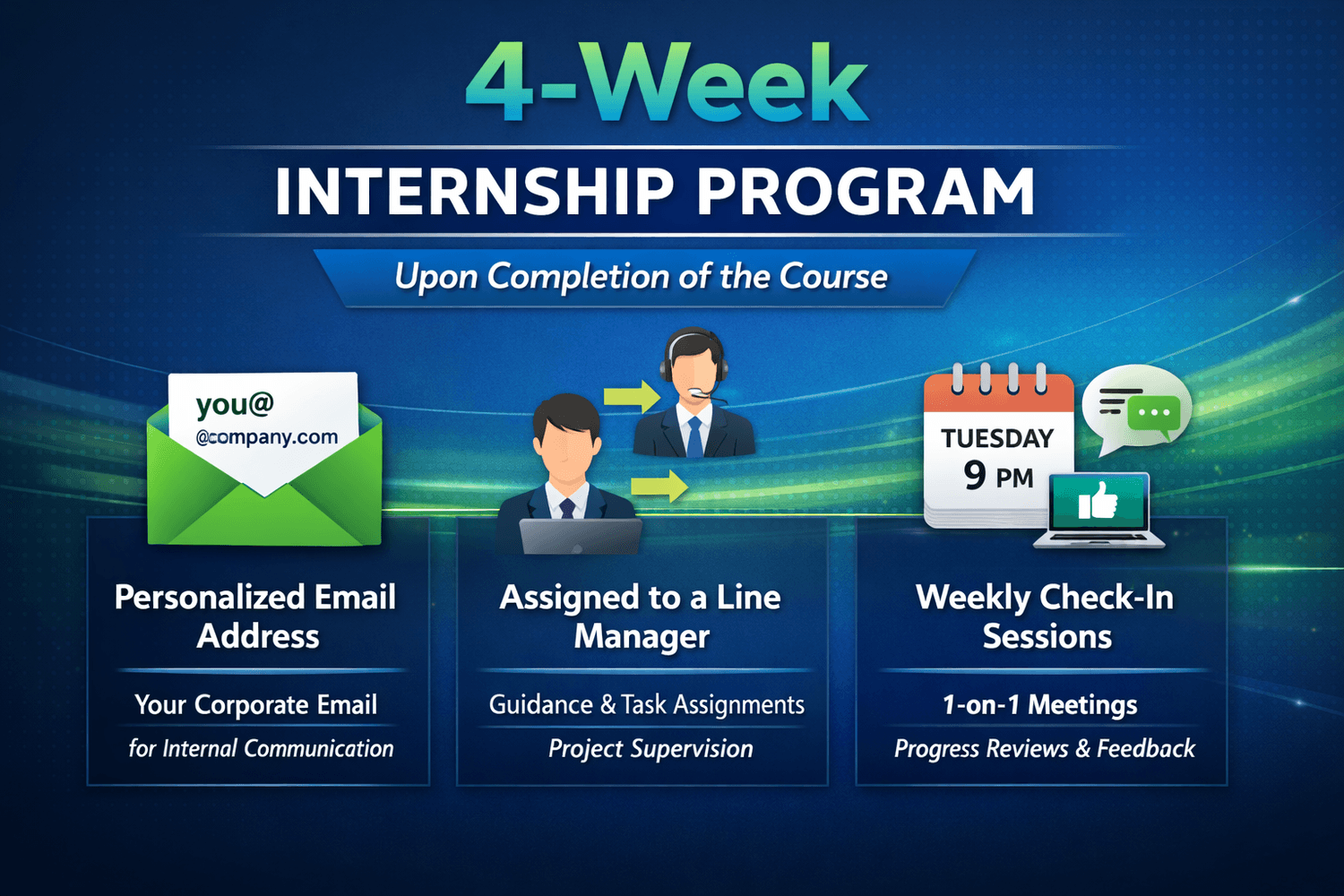 A 4-week internship with a corporate email, dedicated line manager, and weekly mentorship to help you gain real-world analytics experience